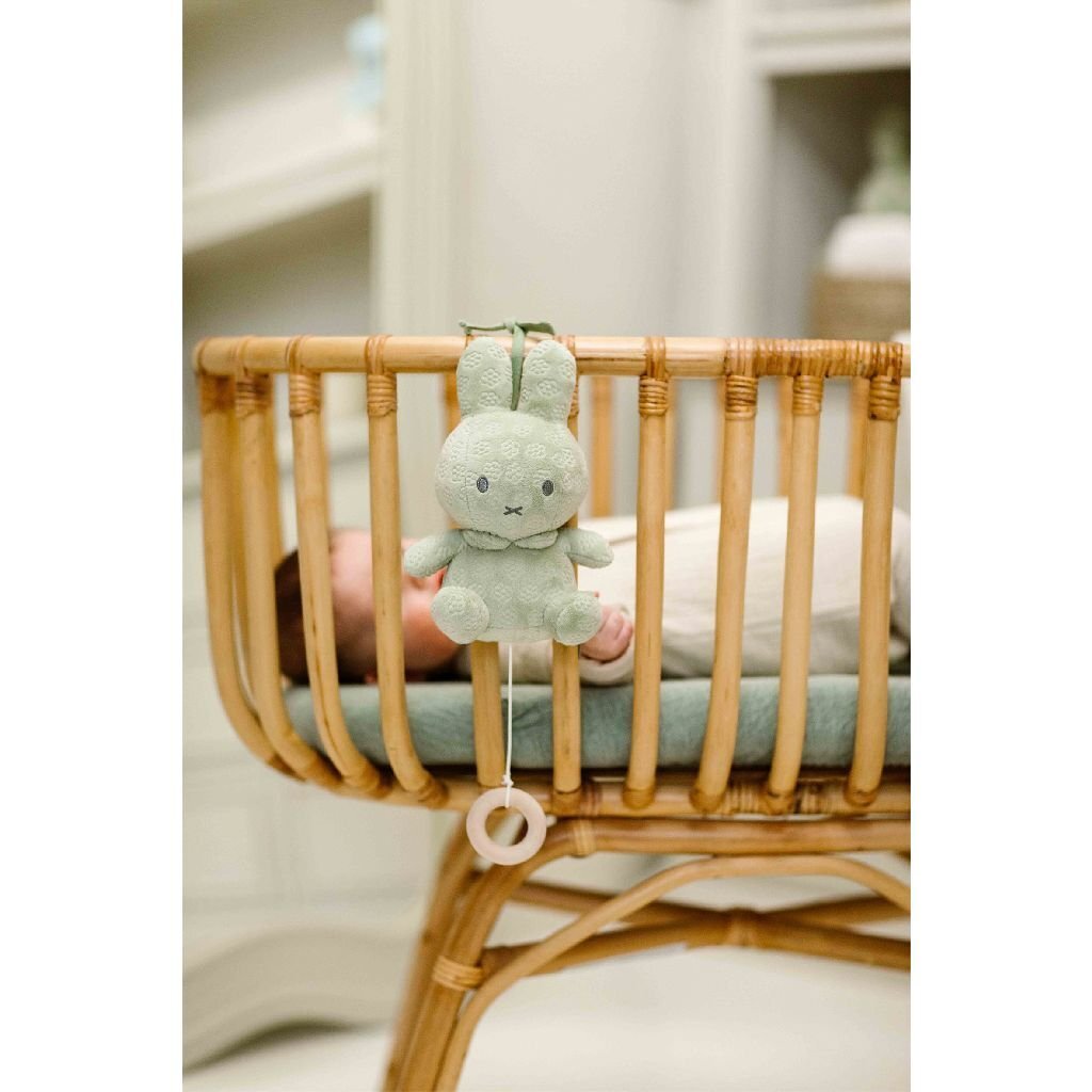 Nijntje, lief klein konijntje. Speel de melodie van het bekende Nijntje deuntje af door aan het touwtje te trekken. Door de zachte stof, met gestanste bloemetjes, is dit muziekdoosje een echte aanwinst voor in de wieg of aan de box. Het muziekdoosje is eenvoudig te bevestigen door middel van het lusje. Kleur: groen. Leeftijd: vanaf de geboorte.