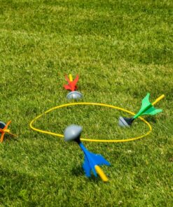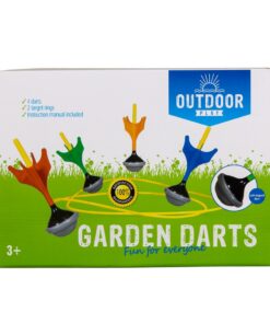 Bij dit spel draait het erom, hoe goed je kunt mikken! Deze Outdoor Play speelset bestaat uit 4 supergrote darts en 2 gele ringen. Je kunt zowel individueel als per team spelen. Wie als eerste 21 punten verdient, wint het spel! De darts zijn uitgevoerd in de kleuren rood, oranje, groen en blauw. Ze hebben een zachte basis, voor een veilig spel. Daarnaast zijn ze aan de onderkant verzwaard, zodat ze altijd recht omhoog komen te staan op het veld. Erg leuk buitenspeelgoed, om mee te spelen op een grasveld of op het strand! Materiaal: foam en kunststof. Lengte van de darts: 23 cm. Diameter van de ring: 50 cm. Geschikt voor kinderen vanaf 5 jaar.