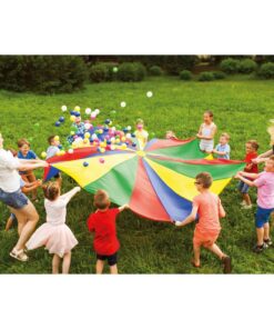 Bij dit spel is het belangrijk dat je goed samenwerkt met je vrienden! Laat de ballen in de parachute stuiteren, maar zorg ervoor dat ze er niet uitvallen. Een vrolijk en leerzaam spel dat zorgt voor een hoop plezier! Dit buitenspeelgoed kan gespeeld worden tot wel 12 spelers. Werk samen om jou ballen als eerste door het gaatje te krijgen.