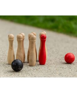 Gooi zoveel mogelijk kegels om in twee beurten. Strike! De hoogste score wint. De set bestaat uit 9 kegels (20 x 5 cm) en 2 ballen met een diameter van 7,5 cm. Materiaal: hout. Bewaartas met uitgebreide handleiding. Geschikt voor kinderen vanaf 3 jaar.