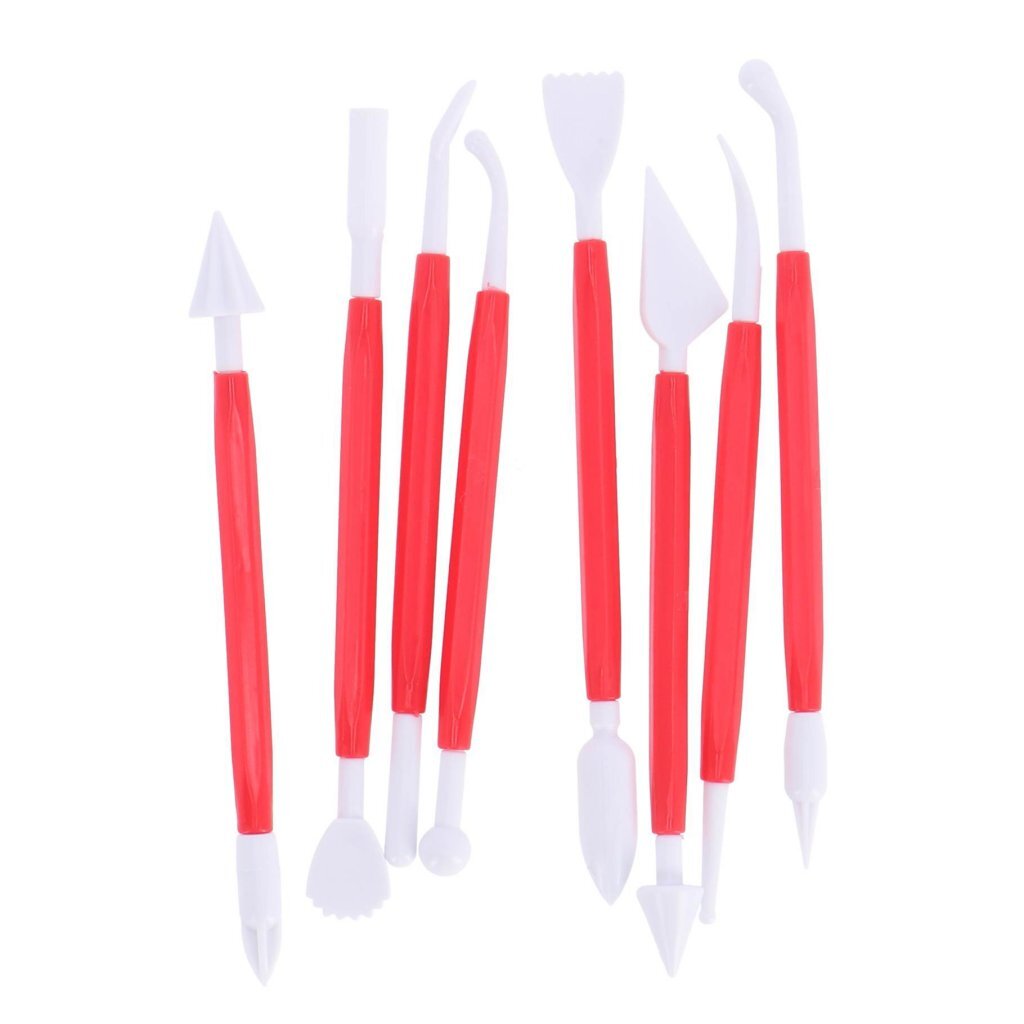 Een modelleerset met 8 tools voor het bewerken van fondant en marsepein. Lengte: 16 cm. Materiaal: kunststof. Kleur: wit, rood.