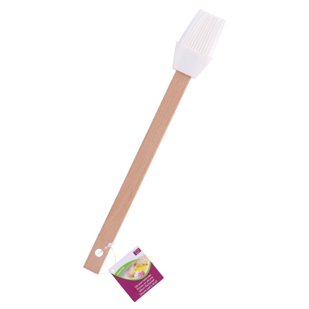 Fijne bakkwast van Patisse voor het invetten van bakvormen, het aanbrengen van glazuur, en het uitsmeren van vleessappen. Met ophangoog. Lengte: 27 cm. Materiaal: siliconen (wit), hout.