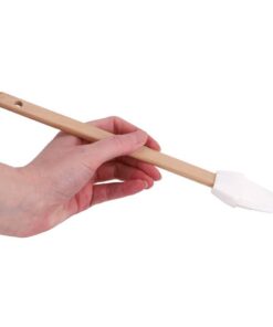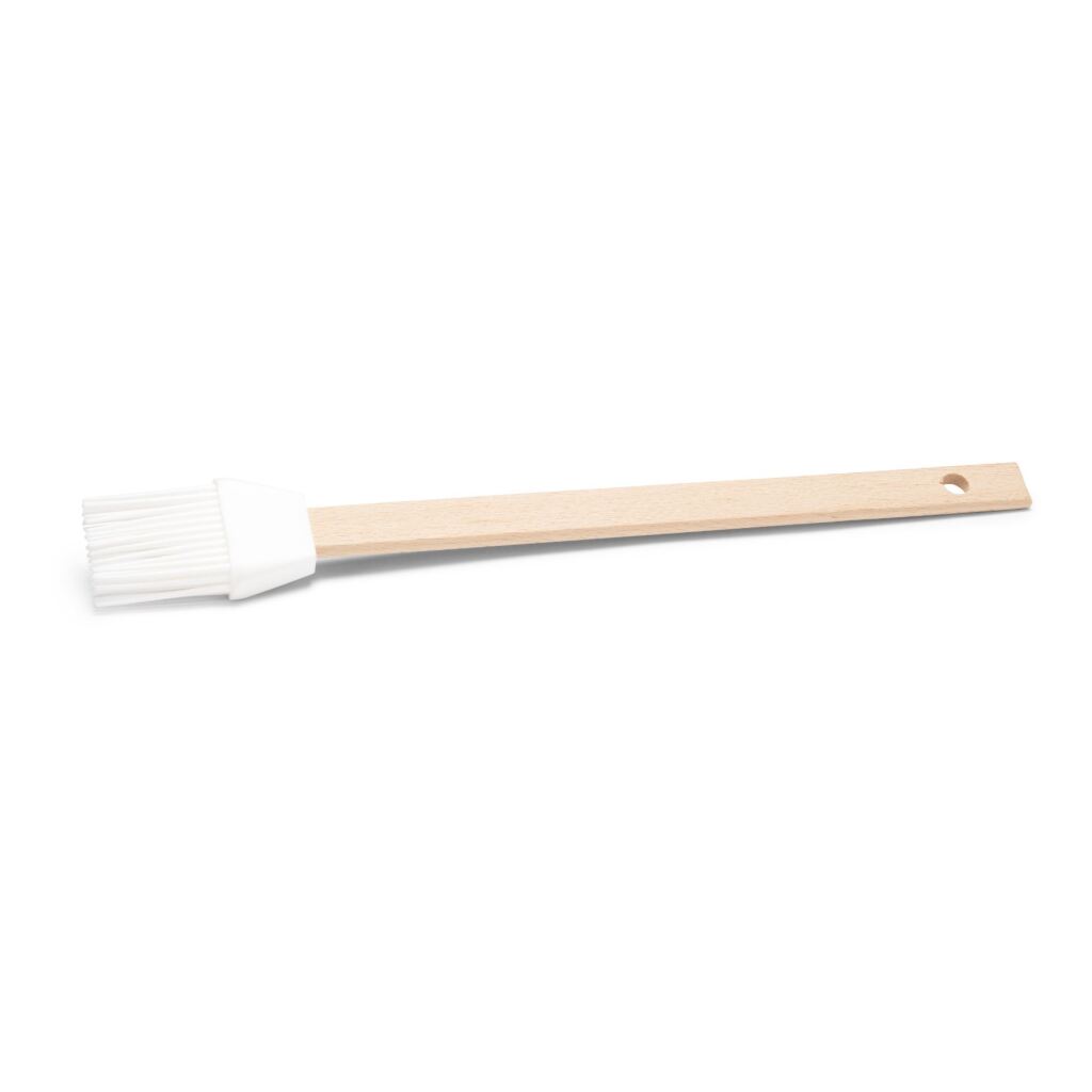 Fijne bakkwast van Patisse voor het invetten van bakvormen, het aanbrengen van glazuur, en het uitsmeren van vleessappen. Met ophangoog. Lengte: 27 cm. Materiaal: siliconen (wit), hout.