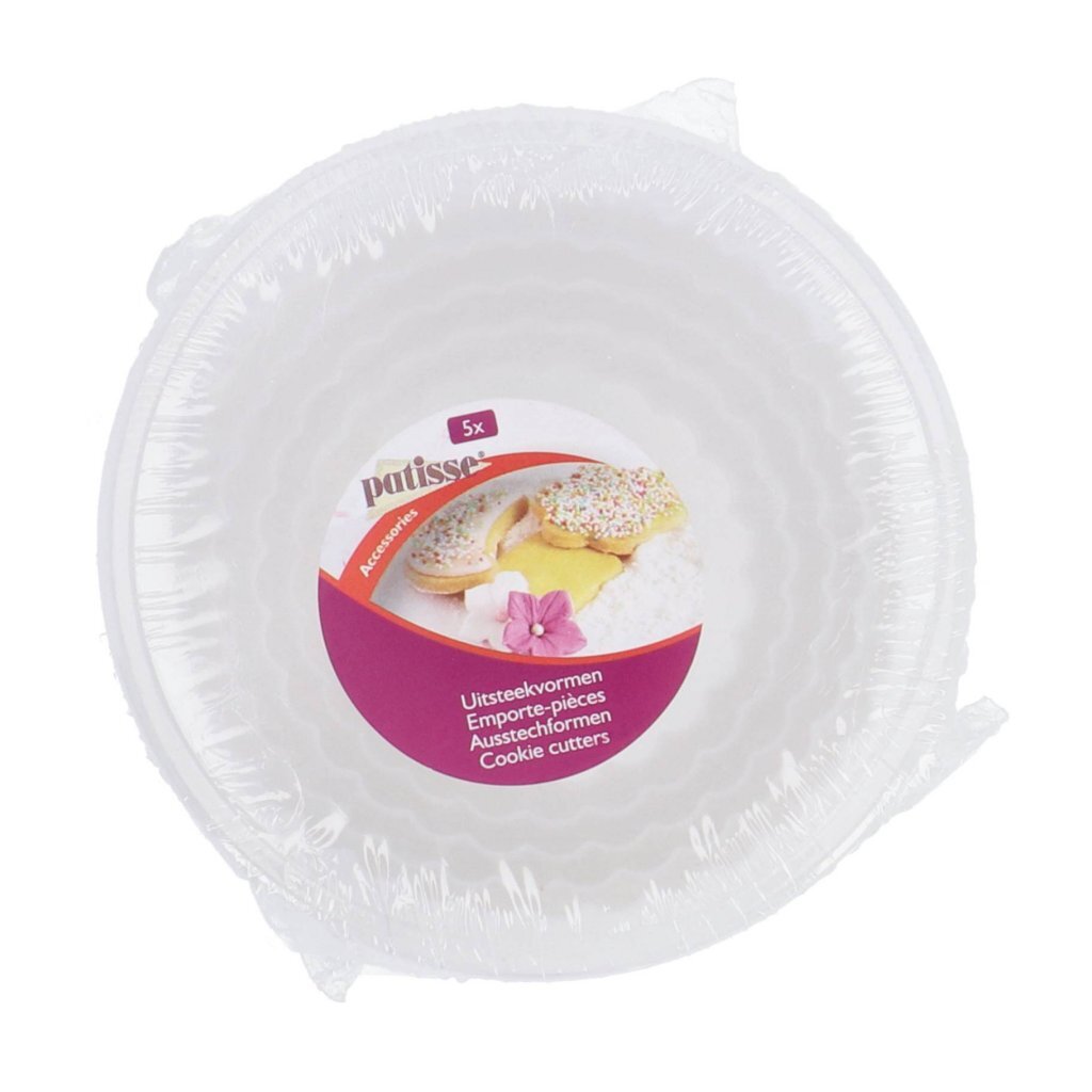 Een 5-delige uitsteekvormenset met 4 gekartelde ronde uitsteekvormen en 1 bewaardoosje. Geschikt voor in de vaatwasser.