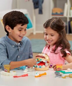 Naar de tandarts eng? Zeker niet! Met deze super leuke Play-Doh set ben jij de tandarts. Laat je patiënt zijn Play-Doh tong uitsteken en maak met de tandenvormp in één keer een hele rij Play-Doh tanden. Staan ze iets scheef? Dan maak je een flashy beugel met de speciale zilverkleurige klei. Met de Confetti klei lijkt het net alsof de tanden vies zijn, of zelfs een gaatje hebben. Geen nood! Even boren met de handaangedreven speelgoedboor en je vult ze met gemak met de spuitpers vol goudkleurige klei. Naast het boortje komt de set met een speelgoedpincet, tandenstoker, spiegeltje, spuitpers, tandenvorm, tandenborstel, flos, beugelroller en speelgoedpatiënt, als ook 8 potjes niet giftige Play-Doh klei (totaal 454 gram).Geschikt voor kinderen vanaf 3 jaar.