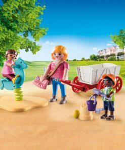 Speel het kleurrijke dagelijkse leven van het kinderdagverblijf na. Samen met hun juf gaan de kinderen naar de speeltuin. Zandspeelgoed en drinkflessen zijn al opgeborgen in de bolderwagen. Zodra ze er zijn, springen de kinderen meteen in de zandbak en op de leuke paardenwip. De speelgoedset bevat drie figuren, een bolderwagen, zandspeelgoed, tas, hoed en andere leuke extra’s voor fantasierijke rollenspellen. De bidon kan in de schoudertas worden opgeborgen. Geschikt voor kinderen vanaf 4 jaar.