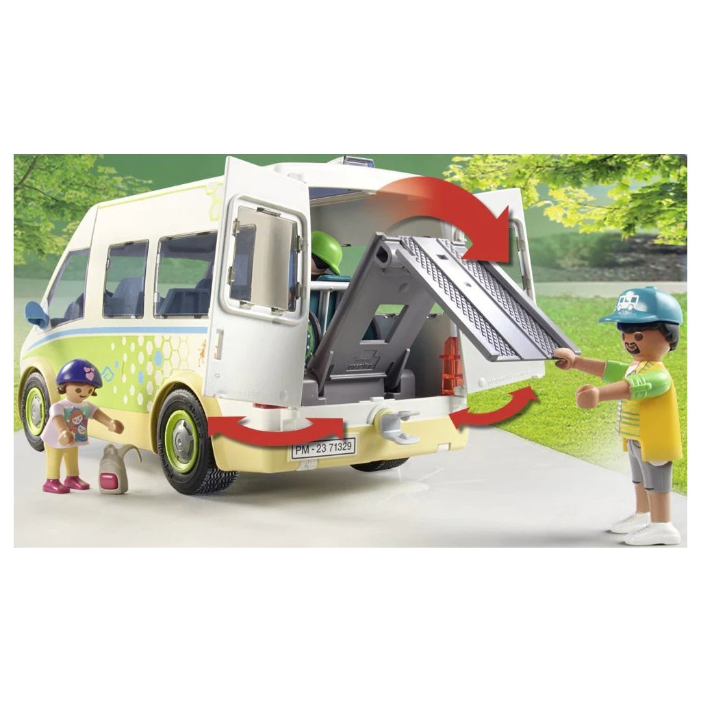 Op naar school! De schoolbus brengt alle kinderen weg. De wachtende kinderen stappen in via de inklapbare oprijplaat voor rolstoelen bij de achterdeuren of via de schuifdeur aan de zijkant. Het dak van de schoolbus kan worden verwijderd, zodat de kinderen en de chauffeur gemakkelijk kunnen instappen. Als er meer opbergruimte nodig is voor bagage voor speciale schoolexcursies, heeft de schoolbus ook een trekhaak. Met de moderne schoolbus wordt zelfs de rit naar school een ervaring. Er is plaats voor vijf figuren in het voertuig. De achterdeuren kunnen worden geopend. Dankzij de inklapbare oprijplaat kan de rolstoel van het kind gemakkelijk in de bus worden geduwd. Om gemakkelijker met het interieur te kunnen spelen, zijn het dak van de chauffeurscabine en het dakpaneel verwijderbaar. De set bevat drie figuren, een schoolbus, een rolstoel, rugzakken en andere geweldige extra’s. Een charmant ontworpen speelset voor kinderen vanaf 4 jaar