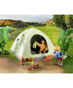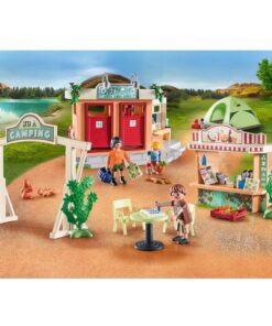 Met een volledig uitgeruste keuken en sanitaire voorzieningen zorgt deze set voor comfort in het dagelijkse kampeerleven. Zodra de tent is opgezet en het kampeermeubilair is geplaatst, zijn de vakantiegangers al druk in gesprek met hun kampeerburen. Er is altijd iets te beleven op de camping! Deze kampeerset is ideaal voor kinderen die dol zijn op kamperen en buitenavonturen. Naast kampeermeubilair omvat de set ook een schoon sanitair gebouw en een keuken. De kiosk biedt lekkere snacks en er is genoeg ruimte om te ontspannen en te genieten van de natuur. Met deze gedetailleerde kampeerset kunnen kinderen hun eigen kampeerverhalen creëren en naspelen. De set bevat drie figuren, een sanitaire ruimte, een kiosk, tafels, stoelen en andere leuke extra’s die bijdragen aan realistische en spannende rollenspelavonturen.