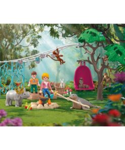De kleine neushoorn is jarig – en iedereen is uitgenodigd! Hij is bijzonder trots op zijn verjaardagskroon. De zeehond grilt lekkere appelkoekjes voor iedereen en de hongerige dieren verzamelen zich rond het knapperende kampvuur wat ruikt het heerlijk! Na de vele rondjes zaklopen met de jongen heeft het konijn dringend een pauze nodig. Gelukkig kon de gastvrouw hem overtuigen om van het lekkere eten te proberen. Als het langzaam donker wordt, begint de lampionslinger te branden. In het Playmobil-bos barst het feest los! Onder de magisch oplichtende slinger viert iedereen feest met muziek, spelletjes en lekkere traktaties. De draaibare hangstoel is een favoriete plek voor dieren en gasten, en er hangt zelfs een banaan klaar om te roosteren boven het kampvuur. Met een zachte verjaardagskroon om te delen en gezellige plekjes rond het vuur draagt elk detail bij aan de feestvreugde. 58-delig. Geschikt voor kinderen vanaf 4 jaar.