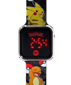 Pokémon LED horloge waarop de tijd in duidelijke rode cijfers wordt weergegeven. Met afbeeldingen van Bulbasaur, Squirtle, Charmander en Pikachu op het bandje. Geschikt voor kinderen vanaf 3 jaar.