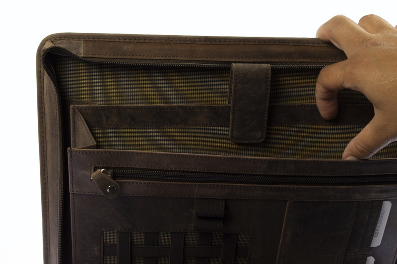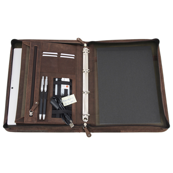 Conferentie Schrijfmap VIGGO Pride and Soul. Incl schrijfblok, diverse opbergmogelijkheden. Gewatteerd tabletvak, vak met rits, 2 pennenlusen, vier kredietkaartgleuven, twee elastieken lussen. Bruin leer. Buitenmaat ca. 35.5 x 28 x 5 cm.