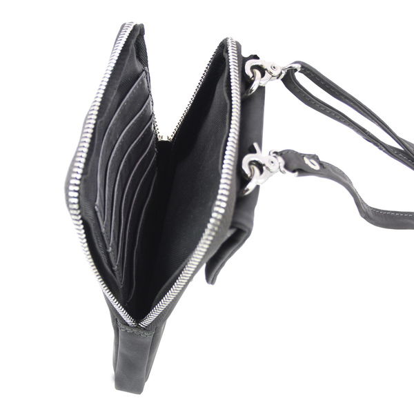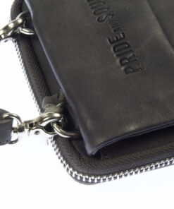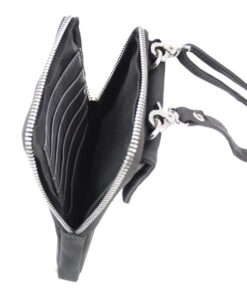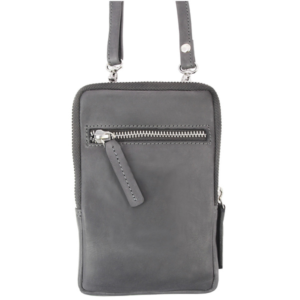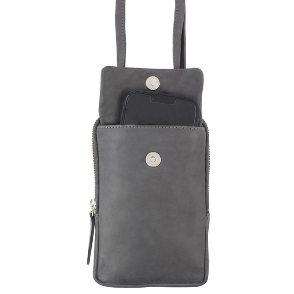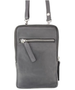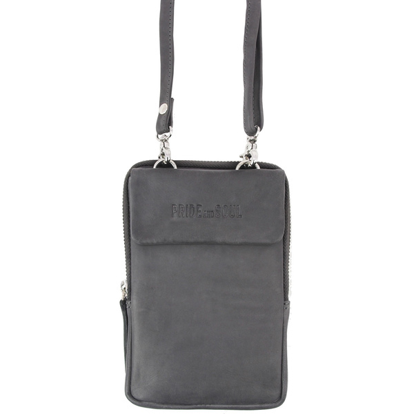 Schoudertas Pride and Soul grijs leer. Met verstelbare, afneembare schouderriem, achterzak met ritssluiting, voorzak voor mobiele telefoon met magnetische drukknoopsluiting, zak met ritssluiting met zes creditcardvakken. 11.5 x 18 x 2 cm