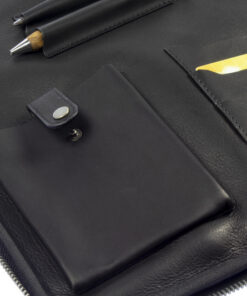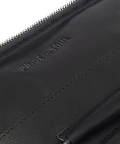 Schrijfmap-tablethoes Pride and Soul TERRA zwart leer. Schrijfmap en tablethoes in één van Pride and Soul TERRA zwart leer met rits rondom, twee vakken met ritssluiting aan de voorzijde, gewatteerd tabletvak, universeel vak, twee pennenlussen, drie vakken voor creditcards/visitekaartjes, vak voor schrijfblok, vak voor collegeblok, A4-blok. 25 x 34 x 2cm.