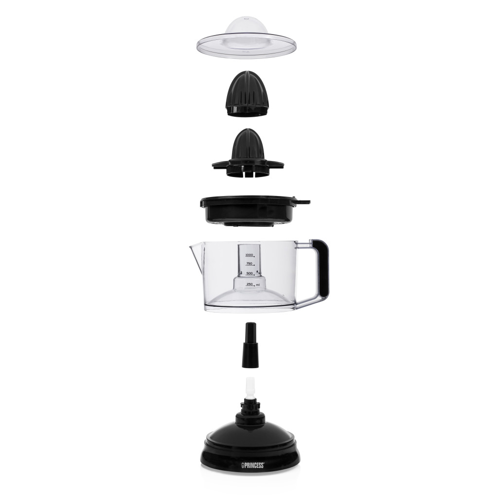 De handige citruspers zorgt ervoor dat je elke dag kan beginnen met een vers glas jus d’orange. De opvangcontainer heeft een inhoud van 1 liter zodat je genoeg sap kan persen voor 4 glazen of sap kan bewaren in de koelkast. Met links- en rechtsdraaiende perskegels voor een extra hoge sapopbrengst. Begin direct met persen De motor schakelt automatisch in als je de halve citrusvrucht op de perskegel duwt dus je kan direct starten met persen. De kleine kegel perst sap van citroenen en limoenen, terwijl de grotere kegel perfect is voor sinaasappels en grapefruit. De transparante deksel zorgt ervoor dat de perskegels nooit per ongeluk ingedrukt kunnen worden en houdt tevens alle onderdelen stofvrij. Het extra handig pulpfilter is instelbaar, zodat je zelf de hoeveelheid pulp in je sap kan bepalen. Makkelijk schoon te maken Alle losse onderdelen van de Princess citruspers zijn vaatwasserbestendig dus na het persen is het schoonmaken van de citruspers snel gedaan.Ā