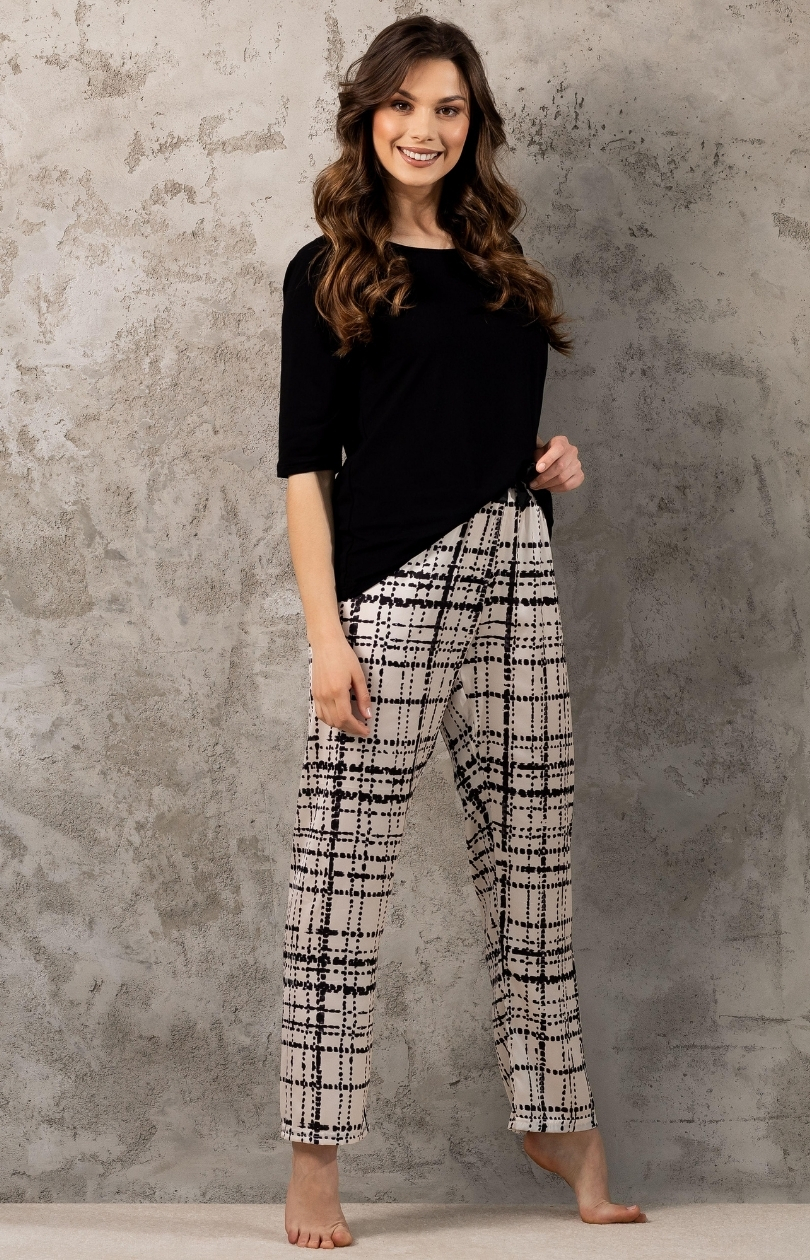 Elegante damespyjama, ook ideaal als cadeau. De blouse met 3/4-mouwen en U-halslijn maakt indruk met zijn stijlvolle oversize snit voor comfort en bewegingsvrijheid. De losse top harmonieert met de comfortabele snit van de lange broek, die een elastische tailleband heeft om comfort tijdens het slapen te garanderen. De pyjama is gemaakt van fijne viscose en elegant satijn, waardoor hij prettig en elegant aanvoelt. De hoogwaardige print van de stof op de broek geeft de pyjama een bijzondere charme. Deze 2-delige pyjama is ontworpen en genaaid in Polen en staat synoniem voor comfort en elegantie.