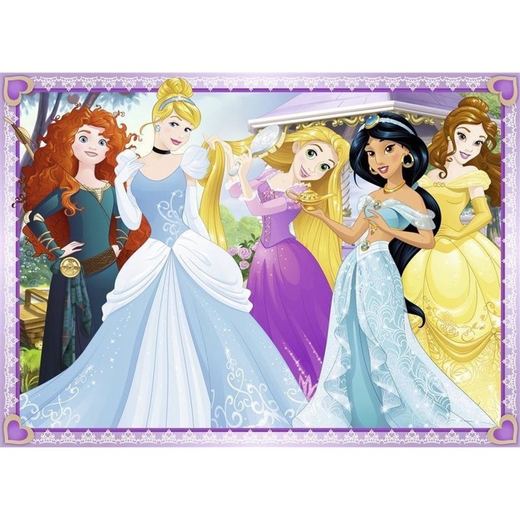 4 puzzels van 100 stukjes, met afbeeldingen van verschillende Disney prinsessen, waaronder Ariel, Belle, Tiana, Doornroosje, Assepoester, Rapunzel, Merida, Sneeuwwitje en Jasmine. Geschikt voor kinderen vanaf 5 jaar.