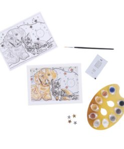 Schilder de genummerde vlakken om een schilderij van een hond en een poes te maken. Inhoud: schilderij, verfkwastje, 10 kleuren verf, lijstje, en instructies. Afmeting: 18 x 13 cm. Met steentjes. Geschikt voor kinderen vanaf 9 jaar.