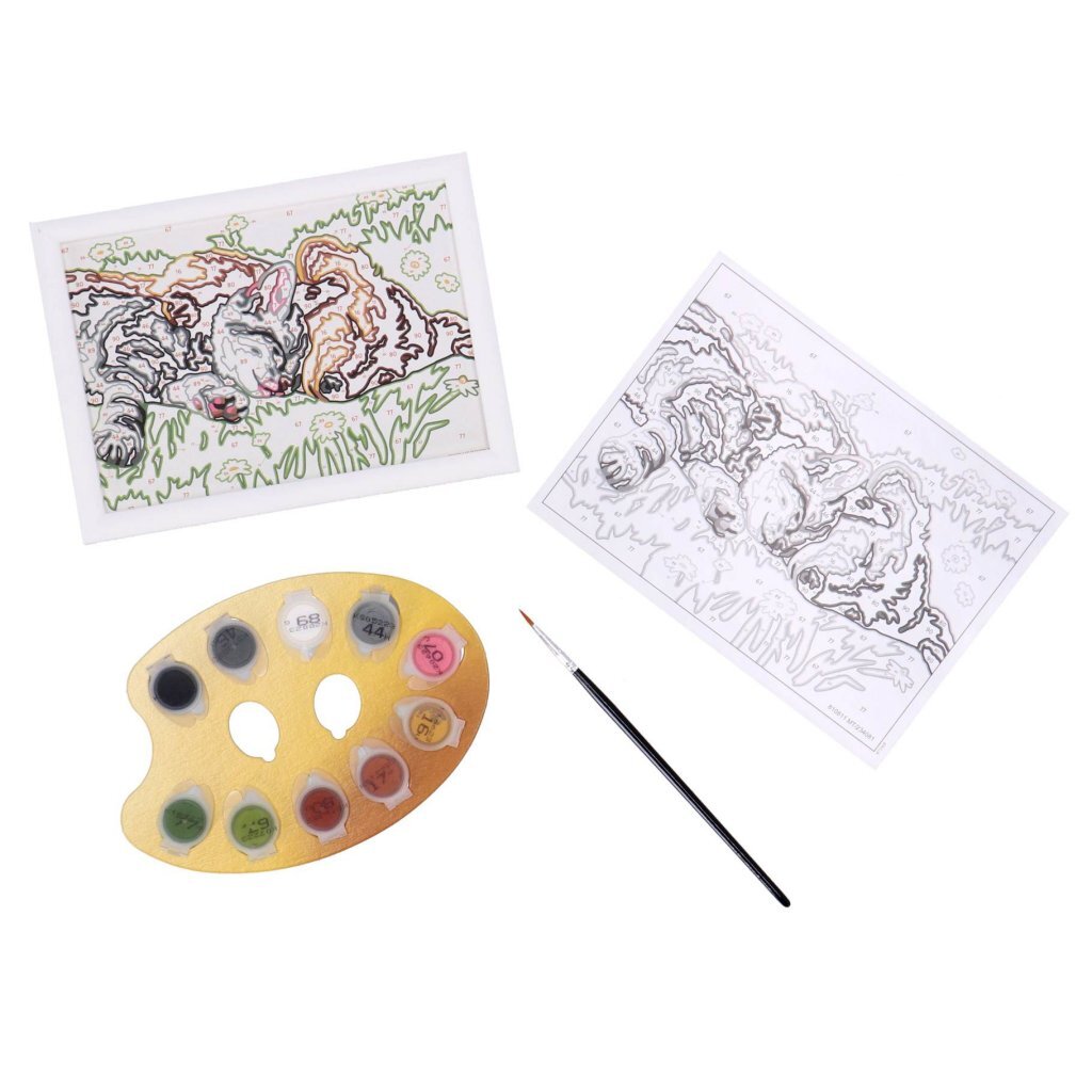 Schilder de genummerde vlakken om een prachtig schilderij van een kat en een hond te maken. Afmeting: 18 x 13 cm. Inhoud: schilderij, verfkwastje, 10 kleuren verf, lijstje, en instructies. Geschikt voor kinderen vanaf 7 jaar.