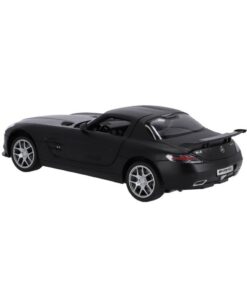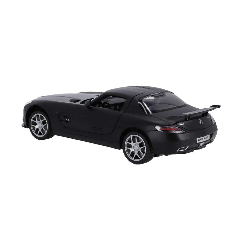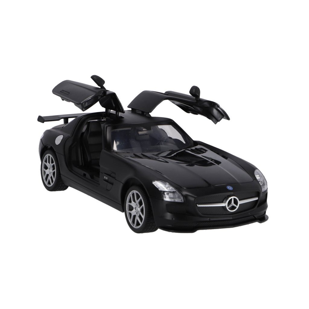 RC zwarte Mercedes-Benz SLS AMG GT Final Edition op schaal van 1:14. Max snelheid 12 km/u. 30 meter bereik. Deuren kunnen open. 2.4 GHZ. Geschikt voor kinderen vanaf 3 jaar.