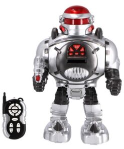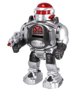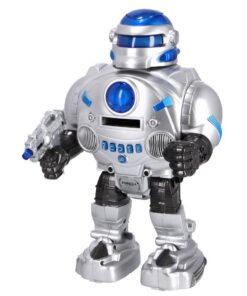 Stoere robot die op afstand bestuurbaar is. De robot is 30 cm groot, en heeft gave licht- en geluidseffecten. Vuurt discs af. Geschikt voor kinderen vanaf 3 jaar.Verkrijgbaar in 2 verschillende kleuren, rood en blauw. U kunt niet kiezen, maar ontvangt een willekeurige kleur.
