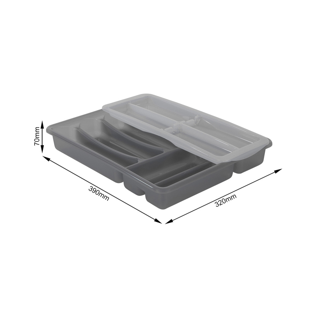 Dankzij de lichte en toch stevige constructie is de BASIC besteklade met de afmetingen 390 x 320 x 70 mm (LxBxH) eenvoudigweg perfect voor alle lades. De in totaal zes compartimenten plus extra bovenglijders bieden plaats aan al het bestek voor zes personen en zelfs meer. De afgeronde randen van de handgreep maken het veel gemakkelijker om de besteklade eruit te tillen. Uiteraard is de Topglide BASIC bestekbak van Rotho voedselveilig en vaatwasmachinebestendig, waardoor deze zonder problemen kan worden gereinigd.