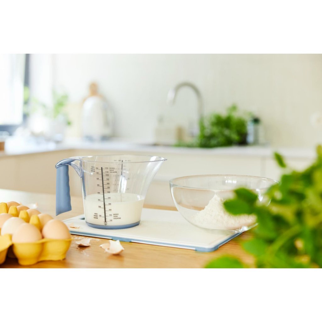 Meerdere gegraveerde schalen voor vloeistoffen, suiker en bloem maken de beker handig bij het koken en bakken. De meetwaarden kunnen zelfs van binnenuit worden afgelezen. De ergonomische softgrip zorgt voor comfortabel gebruik.