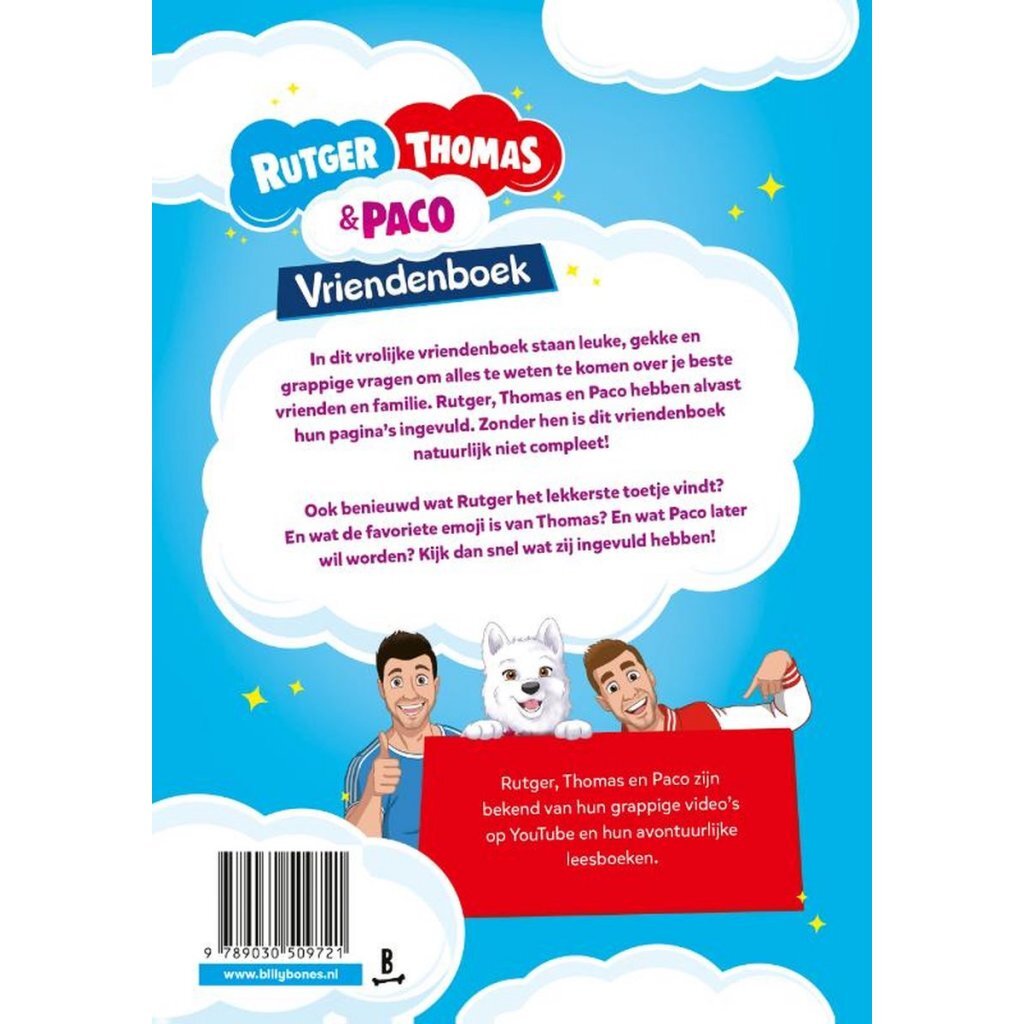 In dit vrolijke vriendenboek staan leuke, gekke en grappige vragen om alles te weten te komen over je beste vrienden en familie.Rutger, Thomas en Paco hebben alvast hun pagina’s ingevuld.