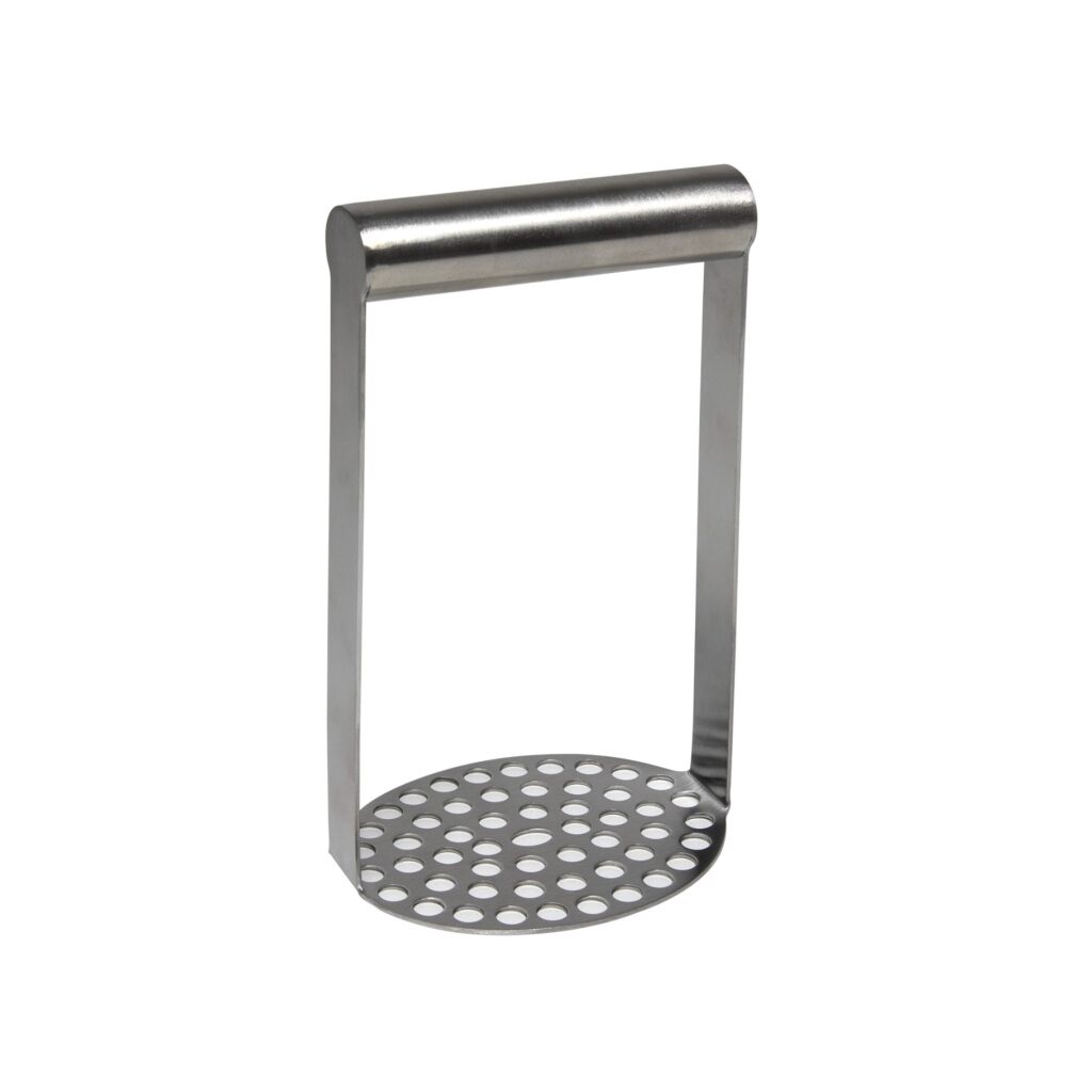 Roestvrijstalen aardappelstamper met handgreep voor het maken van puree. Afmetingen: 11 x 19c x 8 cm.