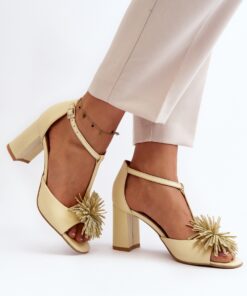 Damessandalen van natuurlijk leer. Op een naaldhak. Bevestigd met een verstelbaar riempje met gesp. Model met beklede hak. Ornament aan de voorkant. Leren binnenzool voor comfort tijdens het gebruik. De snit past bij elegante broeken, rokken en jurken.