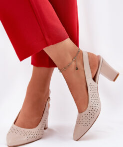 Sandały damskie wykonane z eko skóry, ozdobione ażurowym wzorem, to elegancki wybór na ciepłe dni. Szpiczaste noski subtelnie wysmuklają nogi, dodając im smukłości. Zapinane na sprzączkę z regulowanym paskiem, pozwalają na idealne dopasowanie do stopy. Obcas w formie słupka zapewnia stabilność, a całość łączy styl i wygodę, doskonale komponując się z letnimi sukienkami, spódnicami czy eleganckimi spodniami.