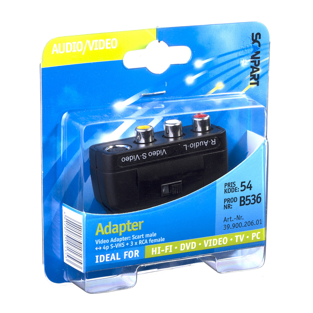 - Aansluiting: scart stekker – 4 pin S-VHS + 3 x tulpkoppeling + schakelaar in/uit