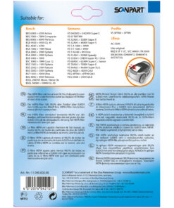 • Passend voor: Bosch BB6.., BBS7.., BBS8.., BSA.., BSC.., BSD, BSF, BSG4.. & Siemens VS04G., VS32./33., VS42./44., VS5.A./B./C./D./E./KA., VS6A., VS7C./D., VS9A., VSQ4 and VSQ5 series