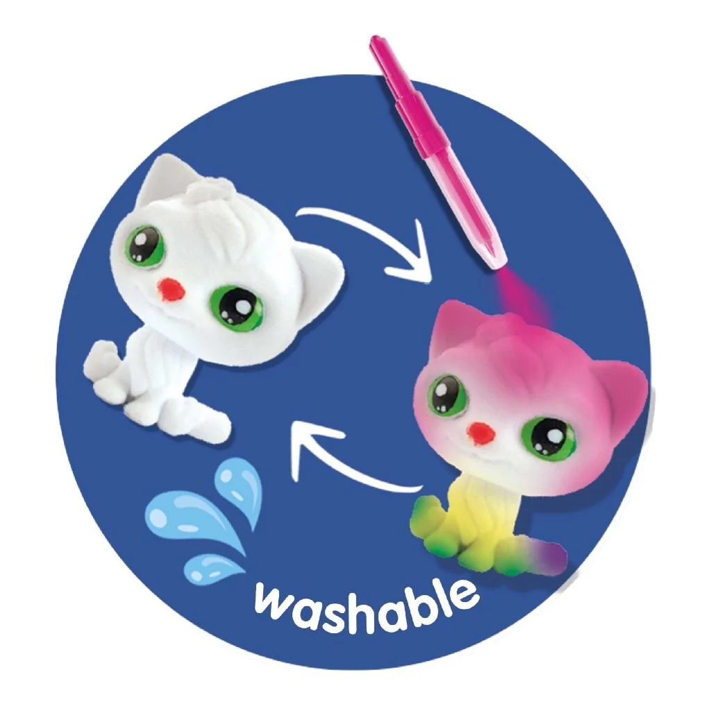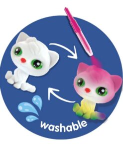 Drie verrassingen wachten om gevonden te worden. Vind de katjes, met hun zachte witte vachtjes. Met de vier gekleurde blaas airbrush pennen geef je iedere kitten vrolijke kleuren, stippen en strepen. Klaar? Was ze onder de kraan schoon en ze zijn klaar voor een nieuwe creatie!