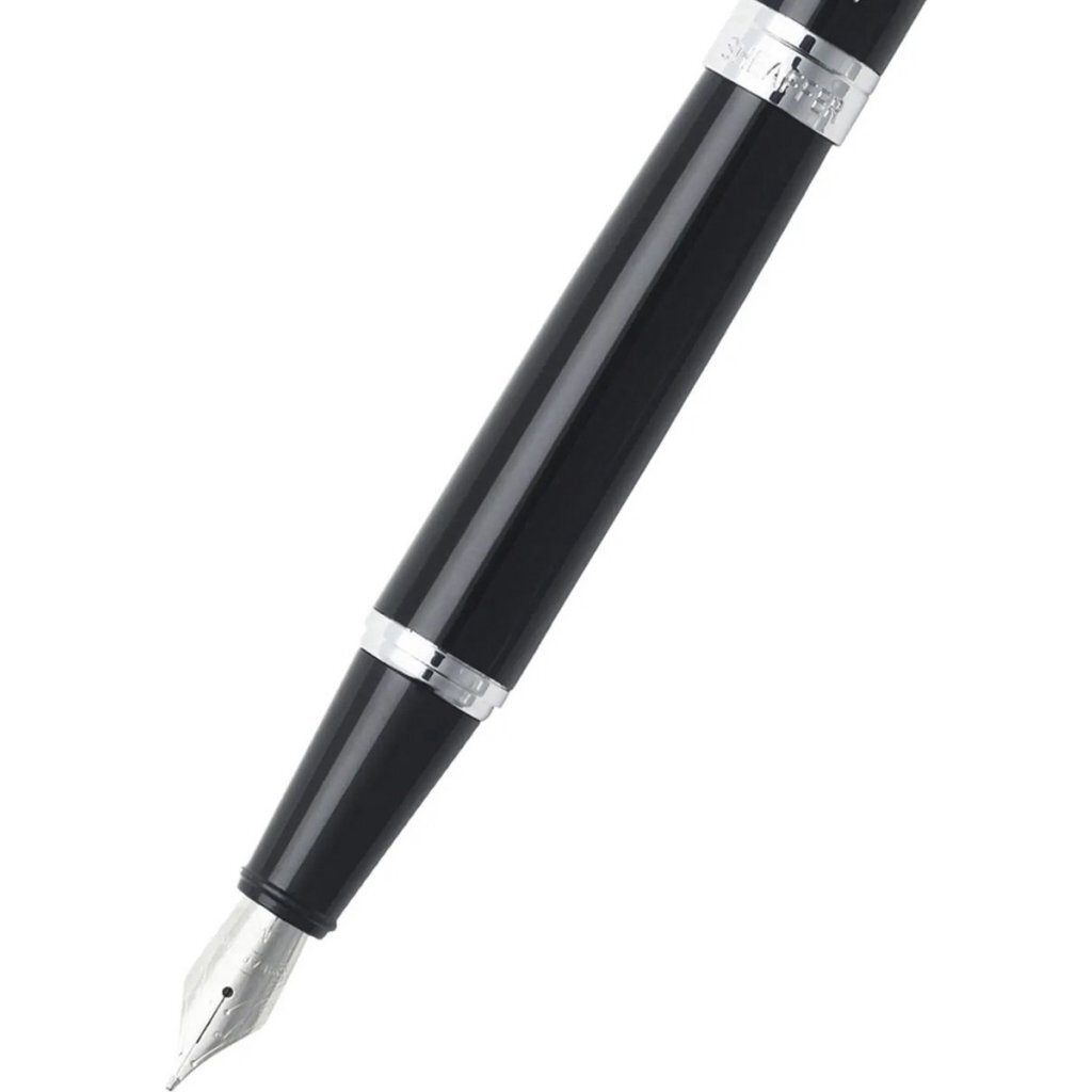 DeSheaffer SF-E0931253 vulpen 300 in glanzend zwart met chroom gepolijste afwerking is voorzien van een medium penpunt M van roestvrij staal dat een nauwkeurig en betrouwbaar schrijfcomfort garandeert. Inclusief een Sheaffer converter die zelf gevuld kan worden. De Sheaffer vulpen 300 met iconische clip met sleuf maakt zijn aanwezigheid bekend met een indrukwekkend, gestructureerd profiel en uitmuntende schrijfprestaties en overbrugt moedig de werelden van het traditionele en het onverwachte. De wereldwijd erkende witte Sheaffer stip, die symbool staat voor schrijfexcellentie, kwaliteit en prestige, is terug te vinden op de clip. De Sheaffer 300 pennen zijn beschikbaar als vulpen, rollerball en balpen in een breed scala van eigentijdse kleuren en worden geleverd in mooie geschenkdoos.
