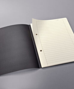 Luxe schrijfblok zijdelings verlijmd. Voorzien van het unieke zwarte softwave-oppervlak. De omslag kan volledig omgevouwen worden hierdoor, neemt het schrijfblok minder ruimte in waardoor het een prettig schrijfcomfort heeft. Handig insteek vak op de achterzijde voor het bewaren van losse bladen. 120 paginas met 2-4 gaats perforatie. 80 grams charmoiskleurige paginas. gelinieerd. A5 zwart