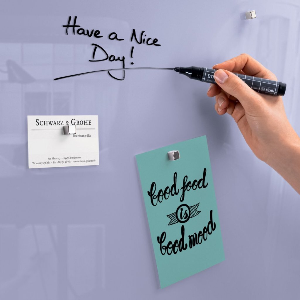 Ideaal als modern alternatief voor het prikbord om gedachten in het homeoffice te visualiseren of to-do’s overzichtelijk te presenteren. Het hoogglans glas-magneetbord uit de internationaal bekroonde Artverum-serie in het formaat 12 x 78 cm in lavendel is eenvoudig te monteren in staand of liggend formaat met het meegeleverde bevestigingsmateriaal en met andere boards met dezelfde afstand tot de wand van 10 mm combineerbaar. Alleen magnetisch met sterke neodymium magneten, beschrijfbaar met krijt- en glasboardstiften, afneembaar met een vochtige of droge doek Frameloos voor een strak uiterlijk – alsof het voor de wand zweeft – en bijna naadloze beschrijfbaarheid op een magneetwand bestaande uit meerdere boards Gegarandeerde productveiligheid: TĆV- en GS-geteste veiligheidsophanging met gleuf voor het bijstellen van kleine boorfouten en voor een nagenoeg naadloze montage van meerdere magneetborden Hoogwaardig veiligheidsglas (ESG, EN 12150-1), met 4 mm glasdikte zeer robuust en krasbestendig Extreem duurzaam met 25 jaar garantie op het glasoppervlak bij gebruik van SIGEL accessoires Artverum is niet zomaar een glas-magneetboard maar een representatief designobject, waardoor u geĆÆnspireerd zult raken.