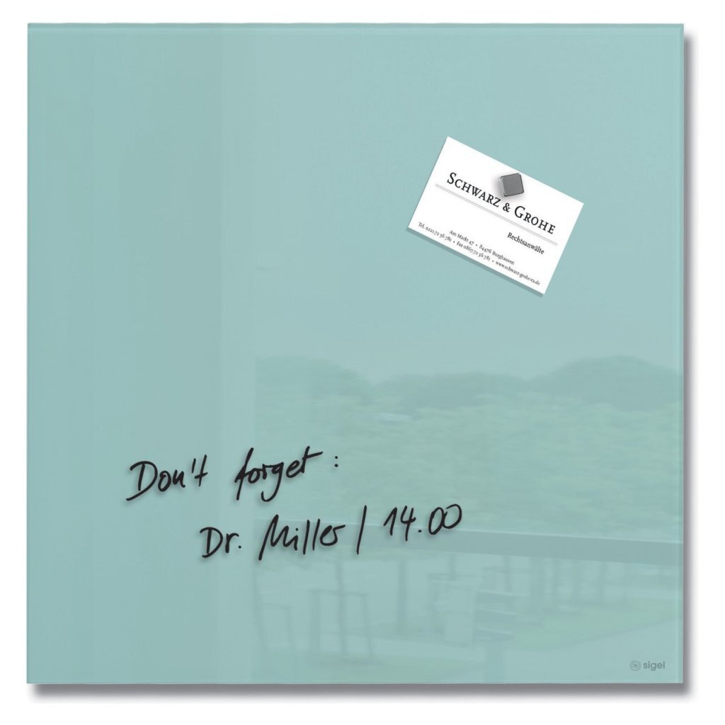 Ideaal als modern alternatief voor het prikbord om gedachten in het homeoffice te visualiseren of to-do’s overzichtelijk te presenteren. Het hoogglans glas-magneetbord uit de internationaal bekroonde Artverum-serie in het formaat 30 x 30 cm in aquamarijn is eenvoudig te monteren in staand of liggend formaat met het meegeleverde bevestigingsmateriaal en met andere boards met dezelfde afstand tot de wand van 9 mm combineerbaar. Alleen magnetisch met sterke neodymium magneten, beschrijfbaar met krijt- en glasboardstiften, afneembaar met een vochtige of droge doek Frameloos voor een strak uiterlijk – alsof het voor de wand zweeft – en bijna naadloze beschrijfbaarheid op een magneetwand bestaande uit meerdere boards Gegarandeerde productveiligheid: TÜV- en GS-geteste veiligheidsophanging met gleuf voor het bijstellen van kleine boorfouten en voor een nagenoeg naadloze montage van meerdere magneetborden Hoogwaardig veiligheidsglas (ESG, EN 12150-1), met 4 mm glasdikte zeer robuust en krasbestendig Extreem duurzaam met 25 jaar garantie op het glasoppervlak bij gebruik van SIGEL accessoires Artverum is niet zomaar een glas-magneetboard maar een representatief designobject, waardoor u geïnspireerd zult raken.