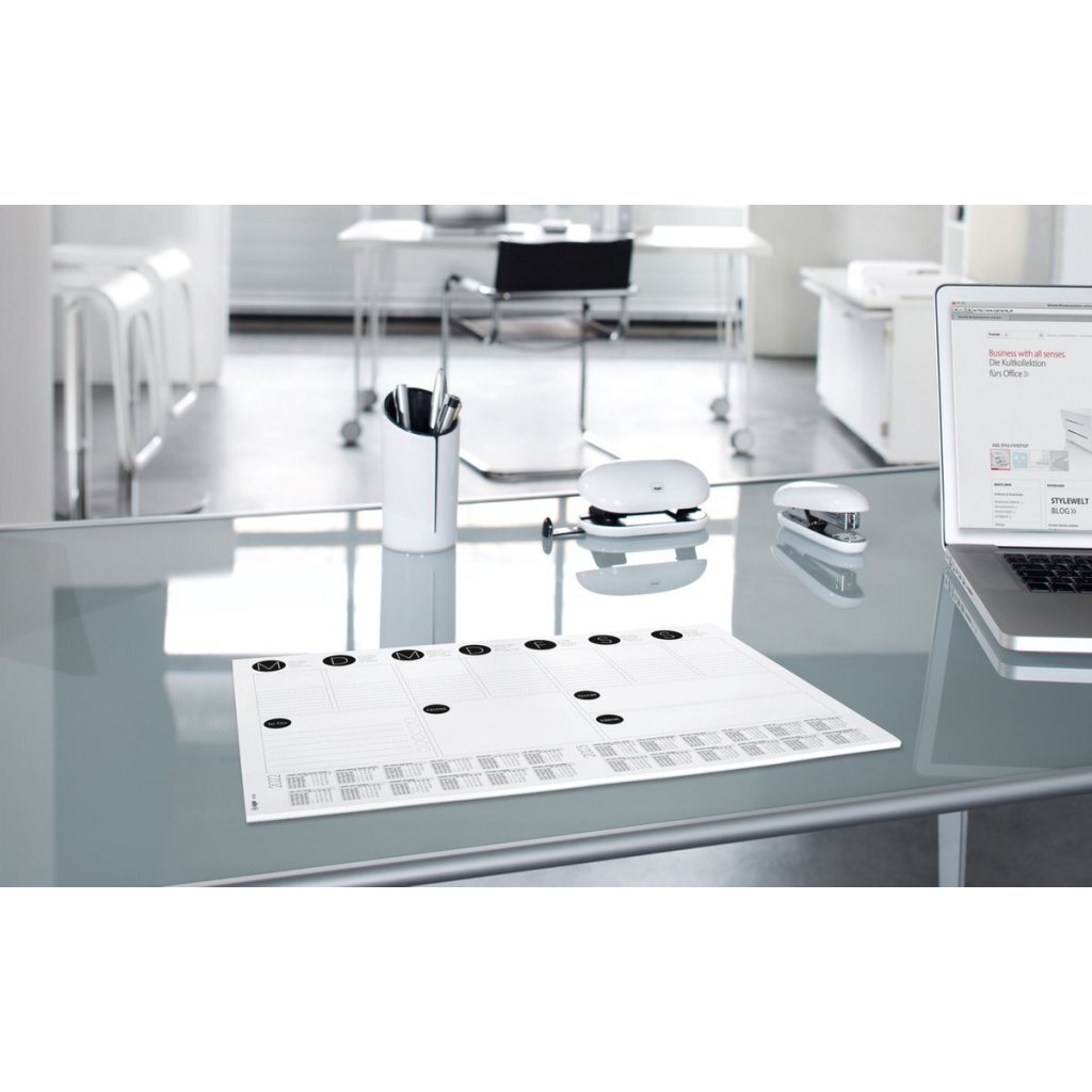 Bureauonderlegger met dag-weekplan en extra veel ruimte voor notities en to-do-lijst. Inhoud 30 vel afscheurbaar en beschrijfbaar en met een actuele 2-jaren kalender. De stevige verlijming aan de onderkant en gedeeltelijk aan de bovenkant voorkomen dat de hoeken omknikken.