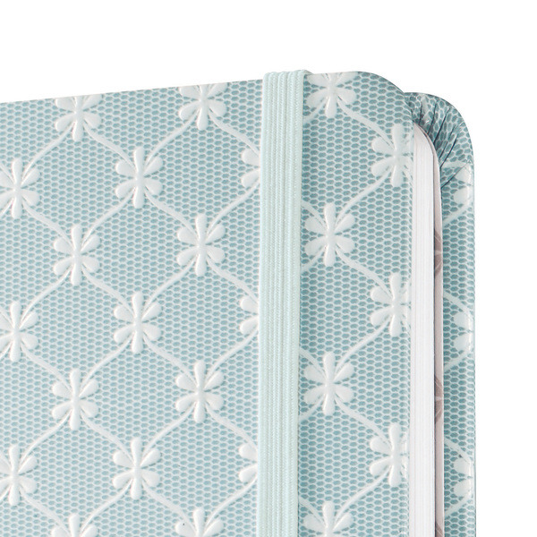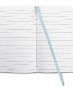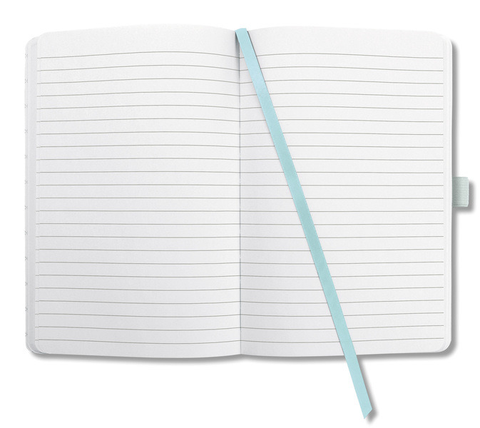 Notitieboek met wit gelinieerd papier, 80grs (zuurvrij, houtvrij en elementair chloorvrij). FSC gecertificeerd. 174 pagina’s waarvan 16 geperforeerd. Het notitieboekje is voorzien van penlus, elastieksluiting, leeslint en opbergvak. De cover is gemaakt van zacht kunststof met een 3D effect en glanslak. Formaat A5: 135x203x16mm. Kleur lichtblauw.