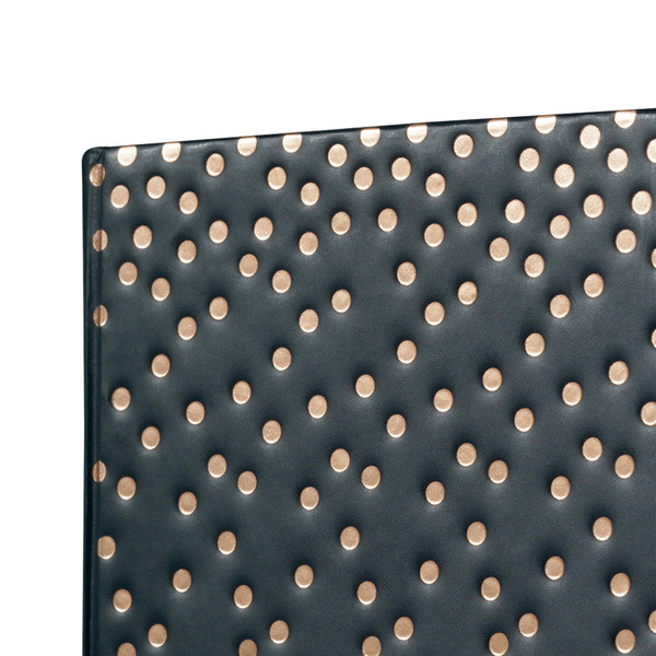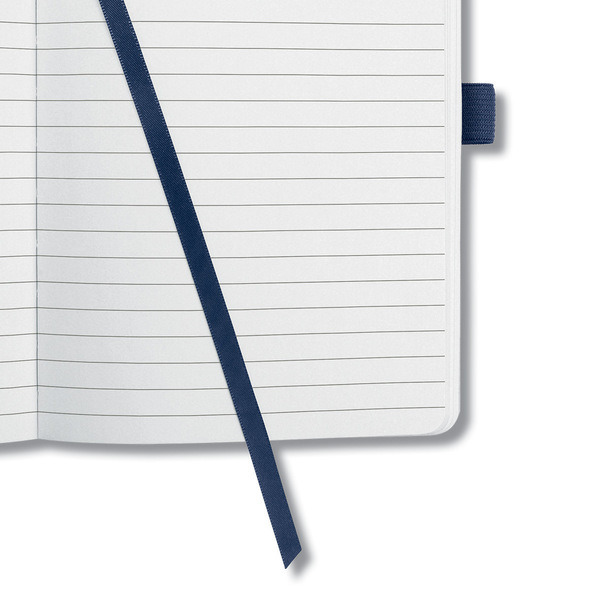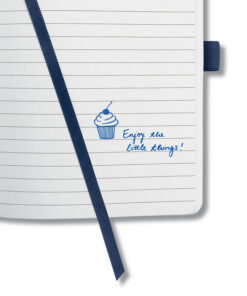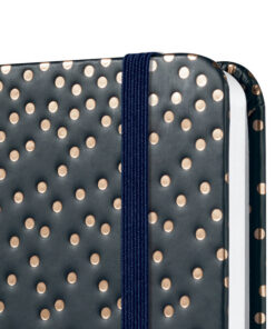 Notitieboek met wit gelinieerd papier, 80grs (zuurvrij, houtvrij en elementair chloorvrij). FSC gecertificeerd. 174 pagina’s waarvan 16 geperforeerd. Het notitieboekje is voorzien van penlus, elastieksluiting, leeslint en opbergvak. De cover is gemaakt van zacht kunststof met een 3D effect en glanslak. Formaat A6: 95x150x16mm. Kleur ‘golden magic’.