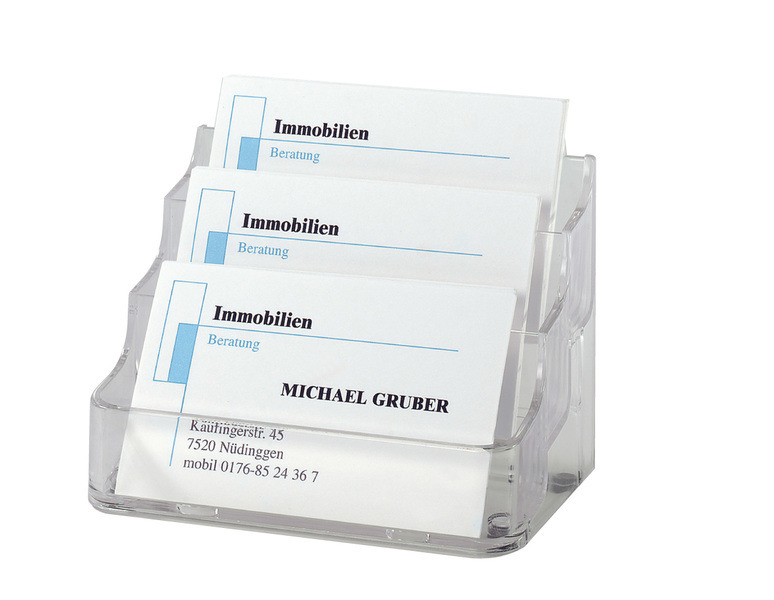 Visitekaarthouder van hoogwaardig, doorzichtig hard plastic gemaakt. Of het nu op de beurs, in een showroom of op de adviesbalie is – in deze houder voor visitekaartjes presenteert u uw visitekaartjes opvallen en goed gesorteerd. Voor visitekaartjes tot een breedte van 94 mm. Uw visitekaartjes zijn altijd goed te zien en steeds beschikbaar om mee te nemen voor uw klanten en bezoekers. Glashelder. Met 3 vakken. Hard plastic. Voor max. 210 kaartjes (max. 94×85 mm).