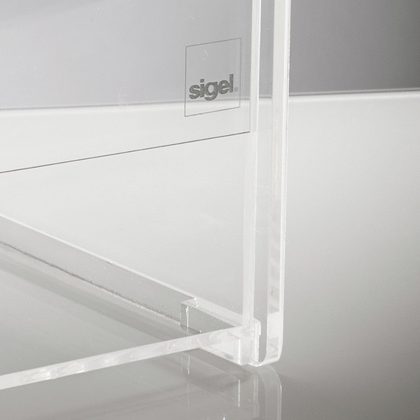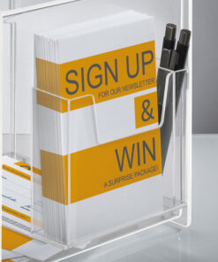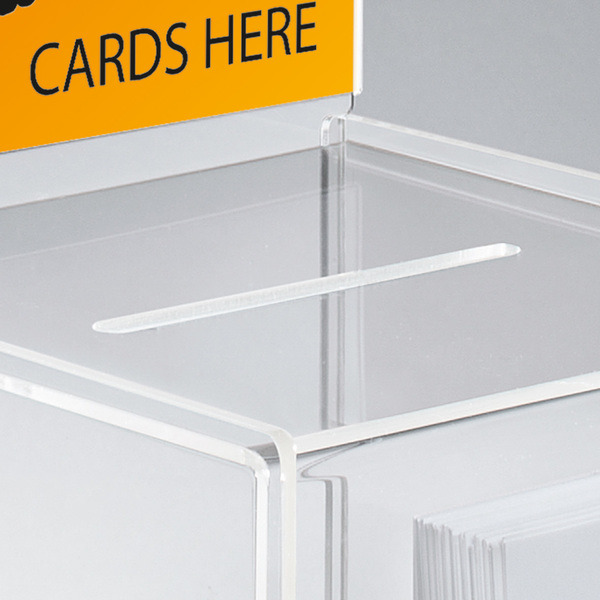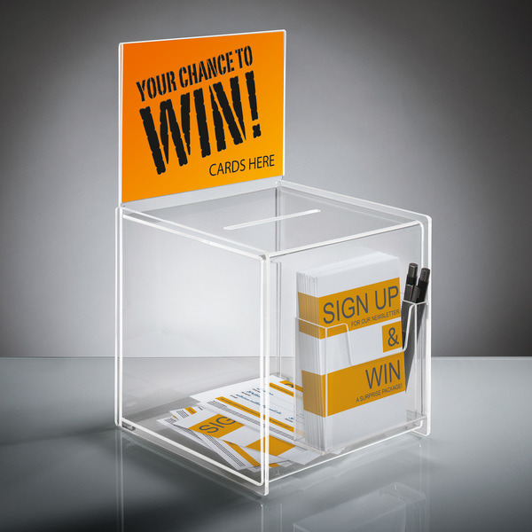Actieondersteuner, of verzamelbox van hoogwaardig, glashelder acryl met een extra compartiment voor folders en pennen. ideaal op beurzen, tentoonstellingen, voor promotieacties of in een hotel – de actiebox is ideaal voor het verzamelen van visitekaartjes, deelnamekaarten, loten en nog veel meer. Presenteer uw onderneming of het doel van uw actie op individuele wijze. insteekpaneel voor A5 liggend. folderhouder geschikt voor DIN lang of A6 formaat. Gleuf: 12×0.8cm doorzichtig. formaat 210x360x210mm.