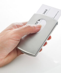 Etui voor visitekaartjes “Snap” van hoogwaardig roestvrijstaal. Voor het veilig opbergen, optimaal beschermen en eenvoudig eruit pakken van de kaartjes. De uitsparing aan de voorkant maakt het mogelijk om met één vingerbeweging snel de visitekaartjes eruit te schuiven. De ingebouwde veer verhinderd dat de kaartjes eruit vallen. In het etui passen maximaal 12 visitekaartjes (max.91 x 57 mm, respectievelijk alle gangbare internationale visitekaartjesformaten). De buitenafmetingen bedragen 60 x 101 x 11 mm (B x H x D).