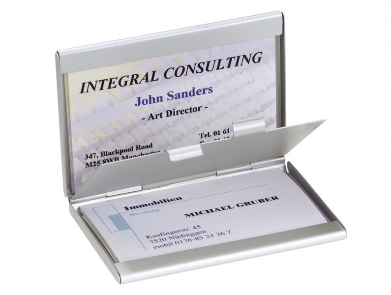 Elegante visitekaartetui Twin gemaakt van hoge kwaliteit aluminium, met 2 vakken voor je eigen en andere visitekaartjes. Ideaal voor onderweg. Mooi design met een mat oppervlak. Voor max. 30 kaartjes (max. 90×58 mm).