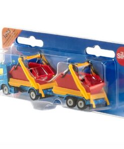 Zand, stenen of bouwpuin – de vrachtwagen met puincontainer en aanhanger neemt flink wat mee! Als trekker dient een twee-assige vrachtwagen met een metalen chauffeurscabine, de aanhanger is voorzien van een chassis met dubbele as en een metalen platform. Op zowel de vrachtwagen als de aanhanger kan een puincontainer worden vervoerd. De afzetinstallatie op beide voertuigdelen kan bewegen zodat de containers heel eenvoudig kunnen worden geplaatst en weer opgeladen. Licht lopende wielen op beide voertuigen zorgen voor wendbaarheid en eenvoudig manoeuvreren. De knalrode containers vormen een opvallend contrast met de blauwe vrachtwagen en de gele afzetinstallatie. Met deze bonte en veelzijdige set voertuigen kunnen steeds opnieuw scenes van de bouwplaats worden nagespeeld!