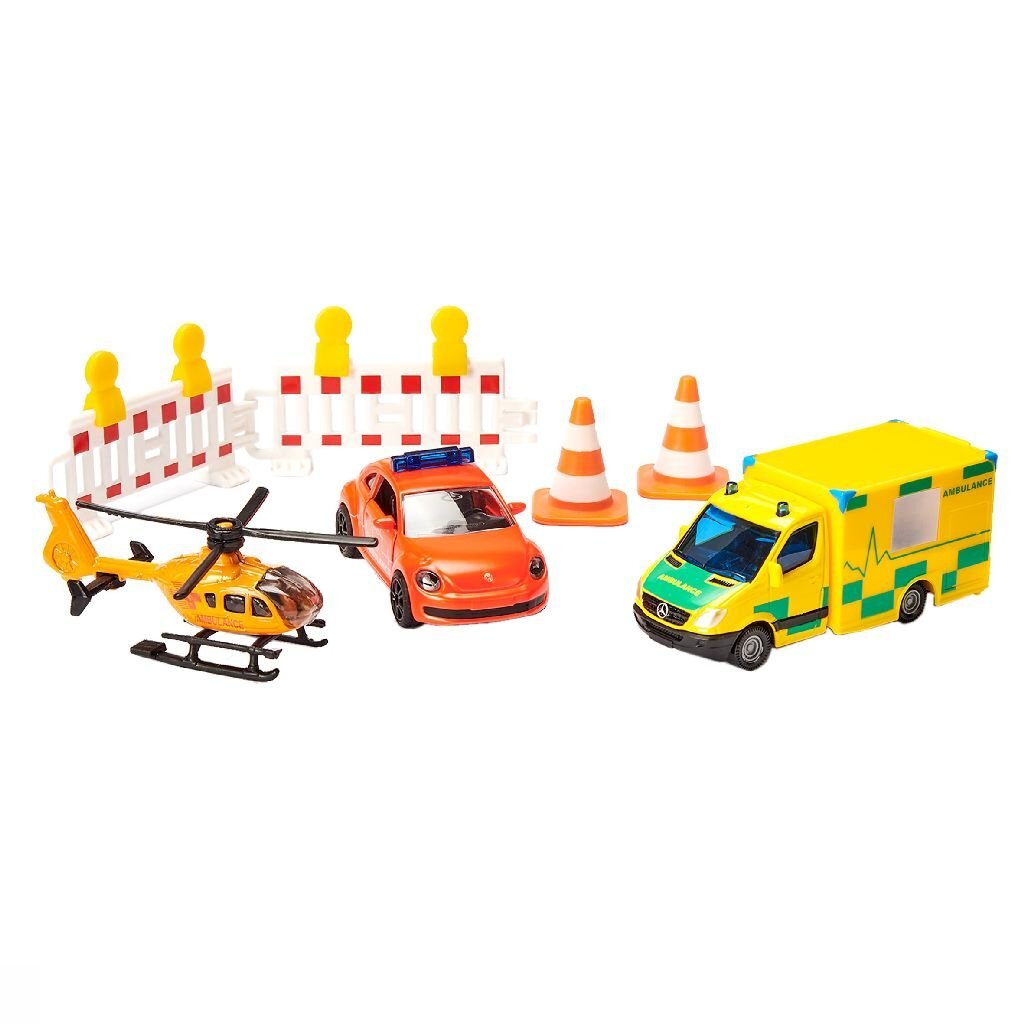Bij een noodgeval telt elke seconde. Daarom is van belang dat de hulpdiensten zo snel mogelijk ter plaatse zijn. Over de weg of door de lucht – met de siku set hulpvoertuigen is snelle hulp gewaarborgd want de levensreddende hulpdiensten zijn al onderweg! De set bestaat uit drie voertuigmodellen en diverse accessoires. De noodarts komt aan in een VW Beetle met internationaal opschrift Ambulance, rode lak en blauwe zwaailichten op het dak. De deuren van het voertuig kunnen worden geopend. Een stralend gele Mercedes Sprinter komt hem te hulp met opvallende signaalopdruk in meerdere kleuren en het opschrift Ambulance in het groen op de zijkanten. Ter ondersteuning uit de lucht is er ook nog een helikopter onderweg. De wieken kunnen worden opgeklapt en kunnen draaien. Om de locatie van het ongeval te beveiligen bevat de set bovendien twee zebraborden en twee oranje-witte pylons.