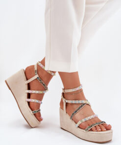 Dames sandalen van imitatiesuède, geplaatst op een sleehak met een platform, combineren stijl met comfort. Ze onderscheiden zich door versierde bandjes die ze een uniek karakter geven. Met een gespsluiting zorgen ze voor een uitstekende pasvorm. Ideaal voor zomerse dagen, ze passen perfect bij jurken, rokken of shorts.