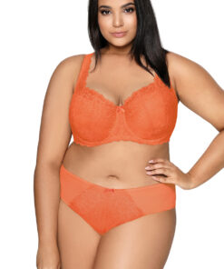 Subtiele, vrouwelijke slip in oranje, gemaakt van bloemenkant, de voorkant is versierd met een klein strikje. Mesh tule inzetstukken aan de zijkanten, achterkant van kant. Randen afgewerkt met rubberen kant.
