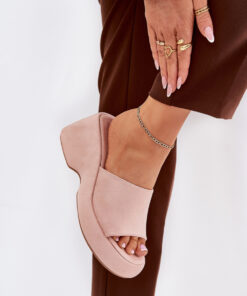 Dames slippers gemaakt van eco-suède, geplaatst op een platform en sleehak, die stijl en comfort combineren. De zachte inlegzool biedt comfort de hele dag. Perfect voor luchtige jurken, stoffen broeken en verschillende uitjes, deze slippers zijn een uitstekende aanvulling op vele zomeroutfits, waarbij ze lichtheid en elegantie toevoegen.