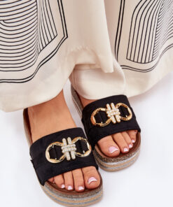 Slippers gemaakt van ecologisch suède. De voorkant is versierd met een opvallend gouden element dat ze een uniek karakter geeft. Geplaatst op een platform met een glitterafwerking, voegen ze een vleugje glans toe aan elke outfit. Deze slippers zijn de ideale keuze voor zomerse dagen, perfect te combineren met jurken, rokken of shorts en voegen een moderne stijl toe aan elke outfit.
